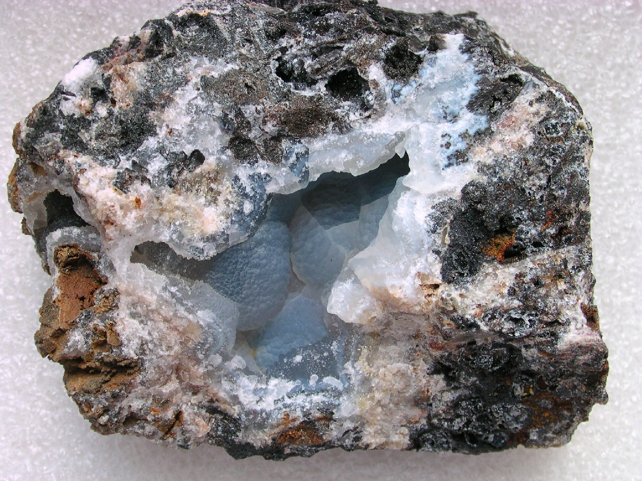 Die Kombination aus Chalzedon und winzigen auskristallisierten Quarz-xx kenne ich ja auch aus meinem Sammelgebiet in Nord-NÖ gut. Offt befindet sich dort - wenn nach der Bildung des Chalzedons noch ein Hohlraum verblieb - ein Rasen aus winzigen Q-xx auf den kugelig-traubigen Chalzedonkrusten, die dann wie "überzuckert" wirken; deutlich seltener liegt auch eine Chalzedonlage über zuvor auskristallisierten xx. Aber auf dem Detailbild von deinem Stück sieht mir das irgendwie anders aus ...