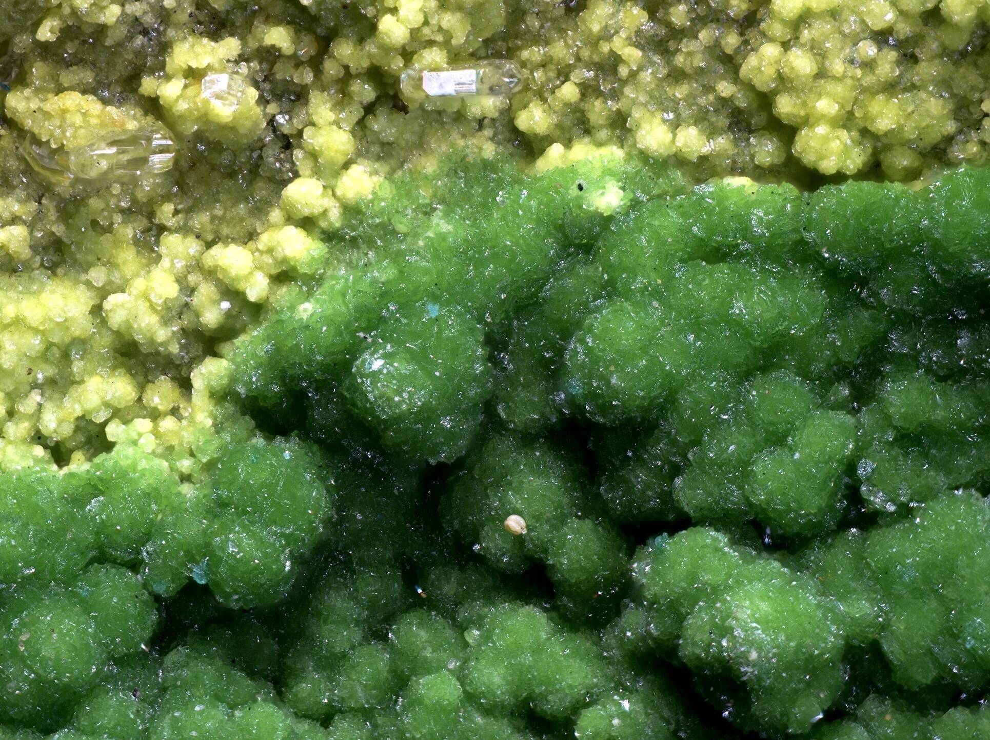 Yancowinnaite & Bayldonite xls. Fov 2.5 mm.
