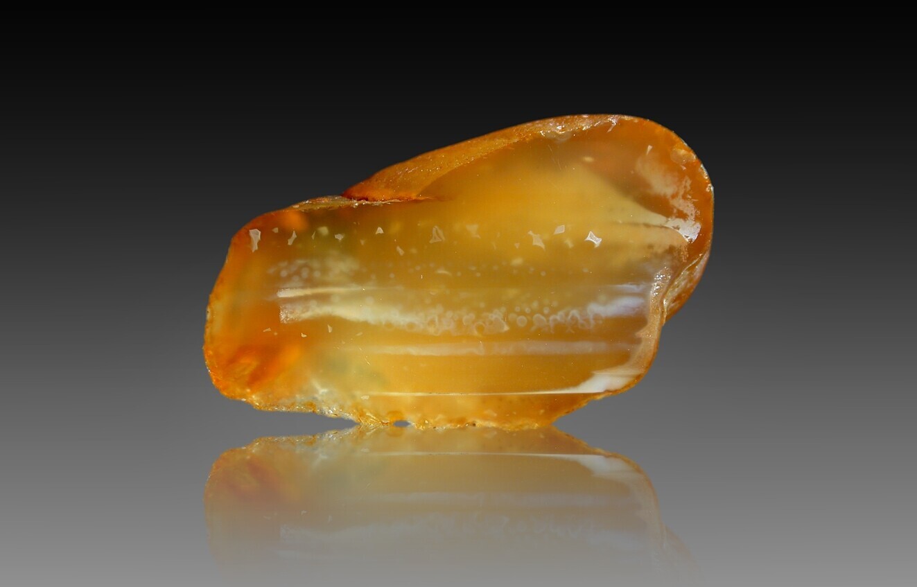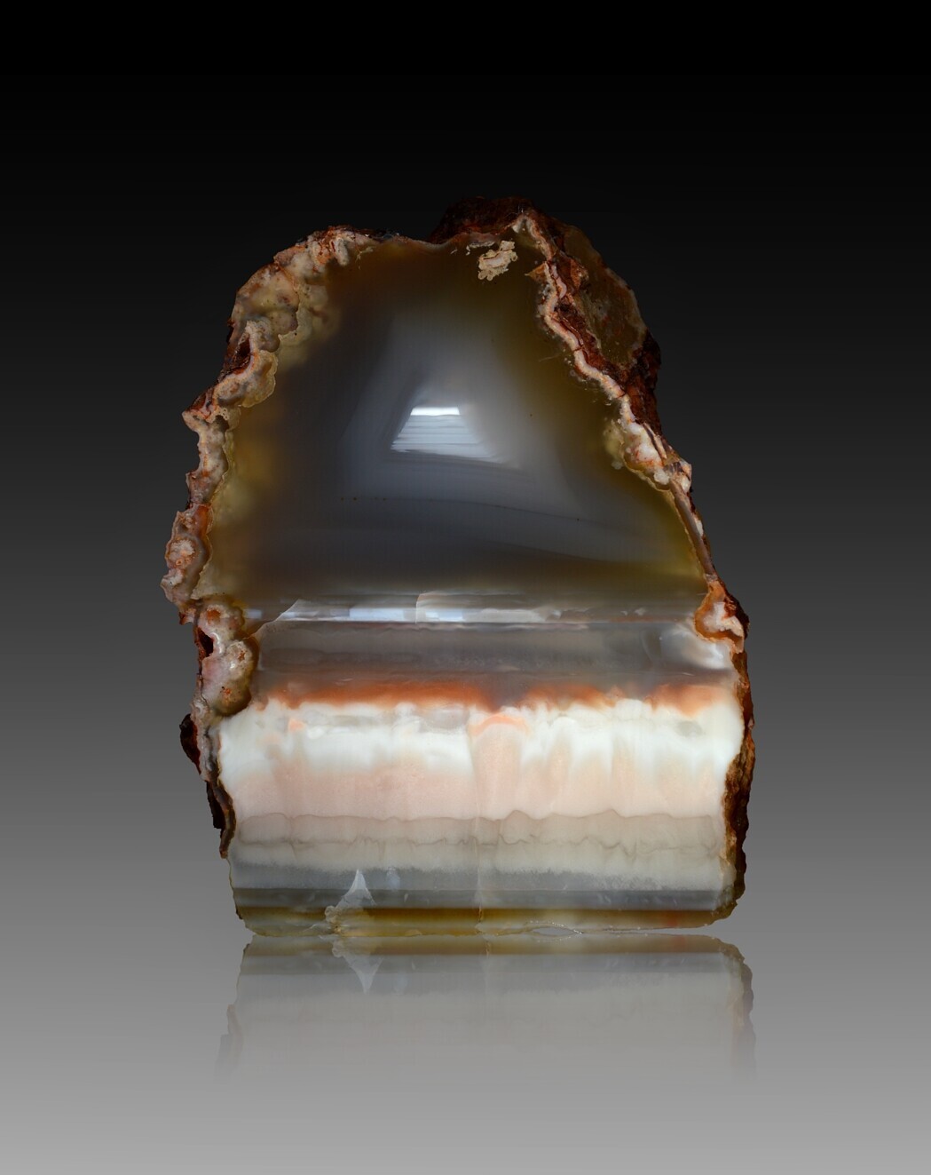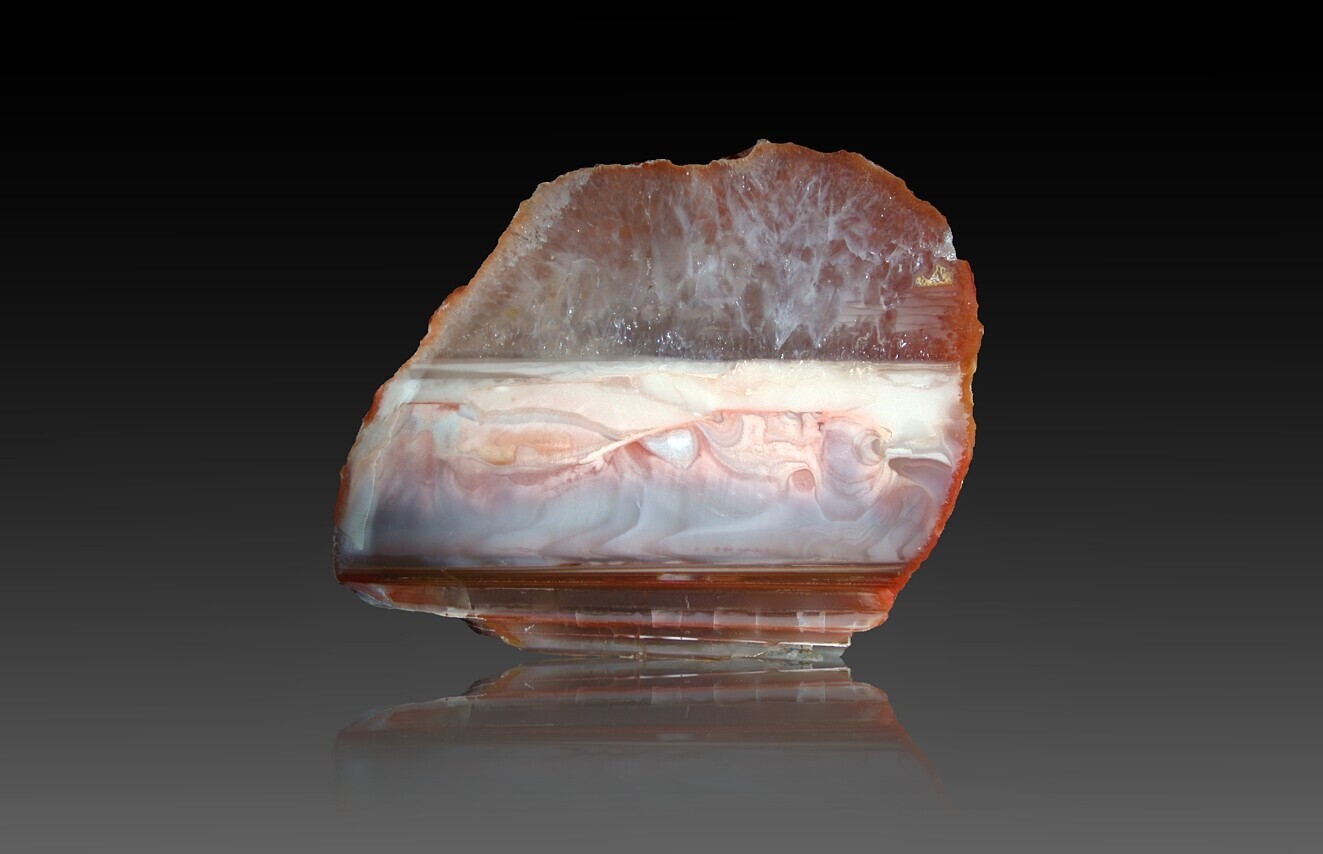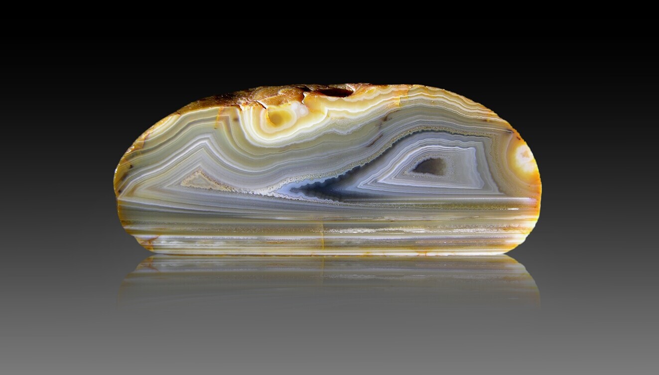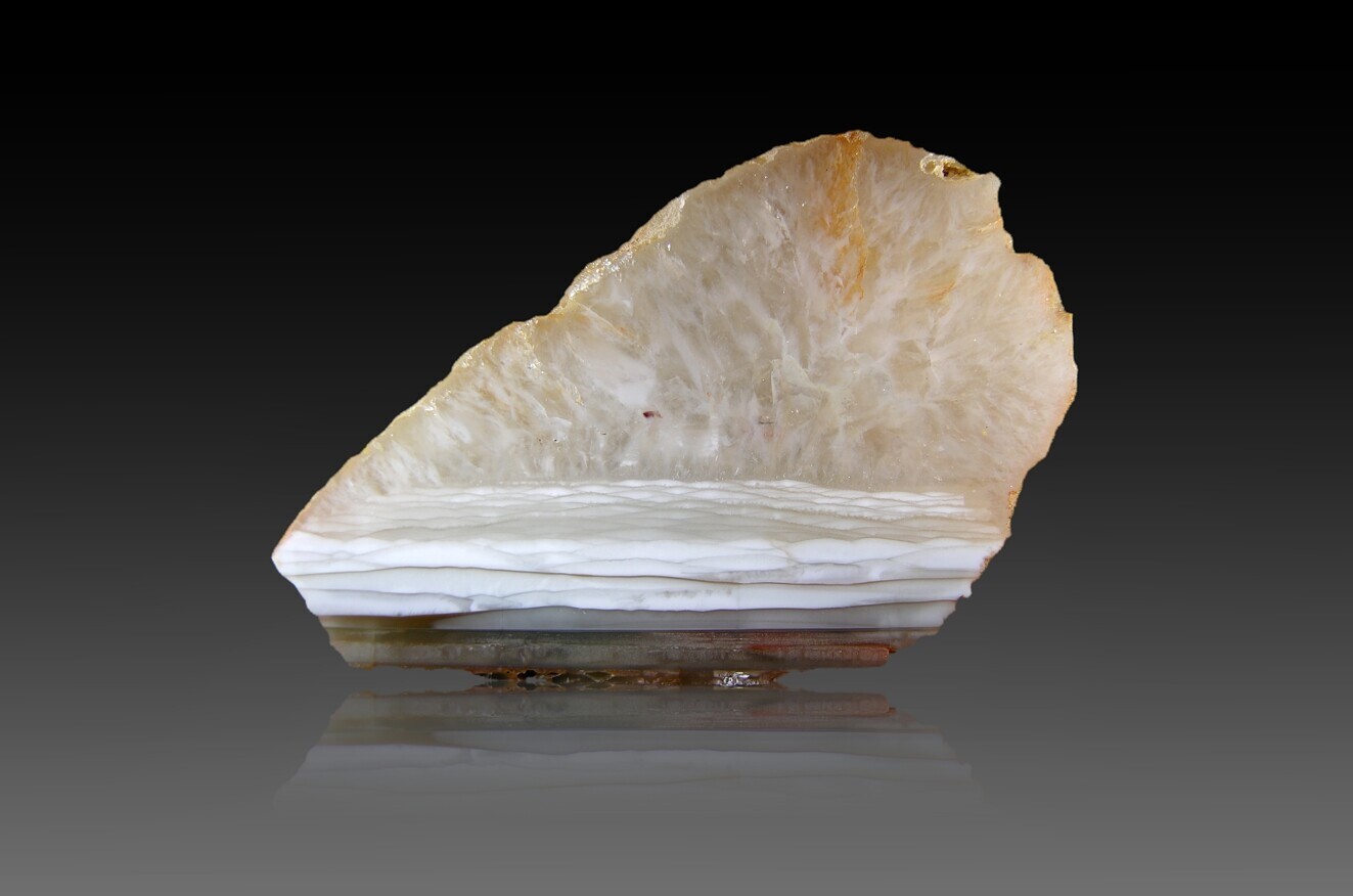 Bei diesem Stein ist die Schnittlage nur wenige Grad zu der parallelen Schichtung gekippt. Es entsteht so dieses segelartige Bild übereinander liegender transluzenter Lagen.