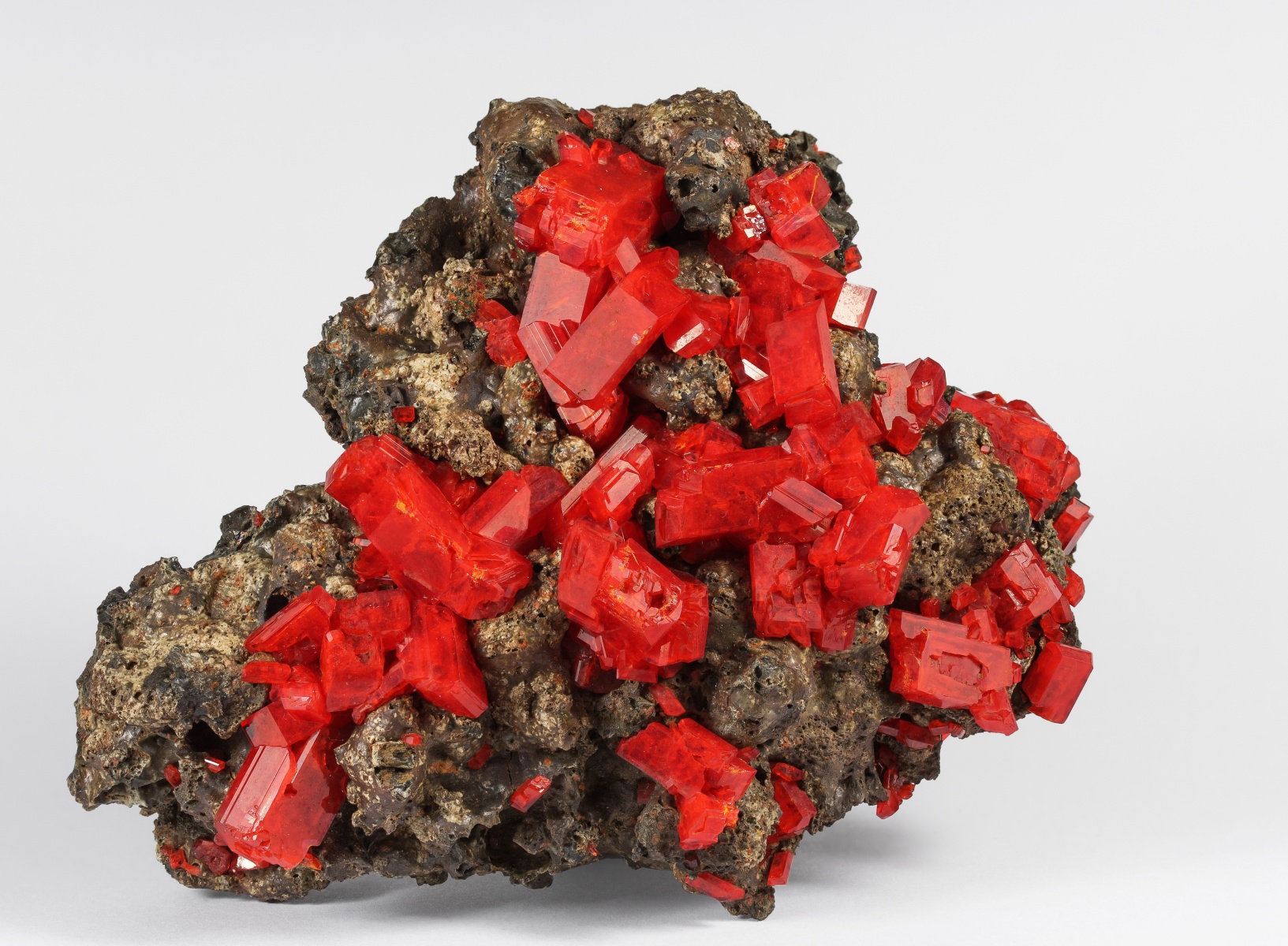 Zum Vergleich aus der "Fälschungsliste" Zuchtkristalle von K2Cr2O7 (Kaliumdichromat) auf einer Schlacke-Matrix.