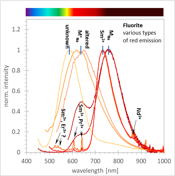 Beim Fluorit von Berbes hatte ich spektrale Beiträge im roten Bereich gefunden, die mit Farbzentren  MNa zusammenhängen.