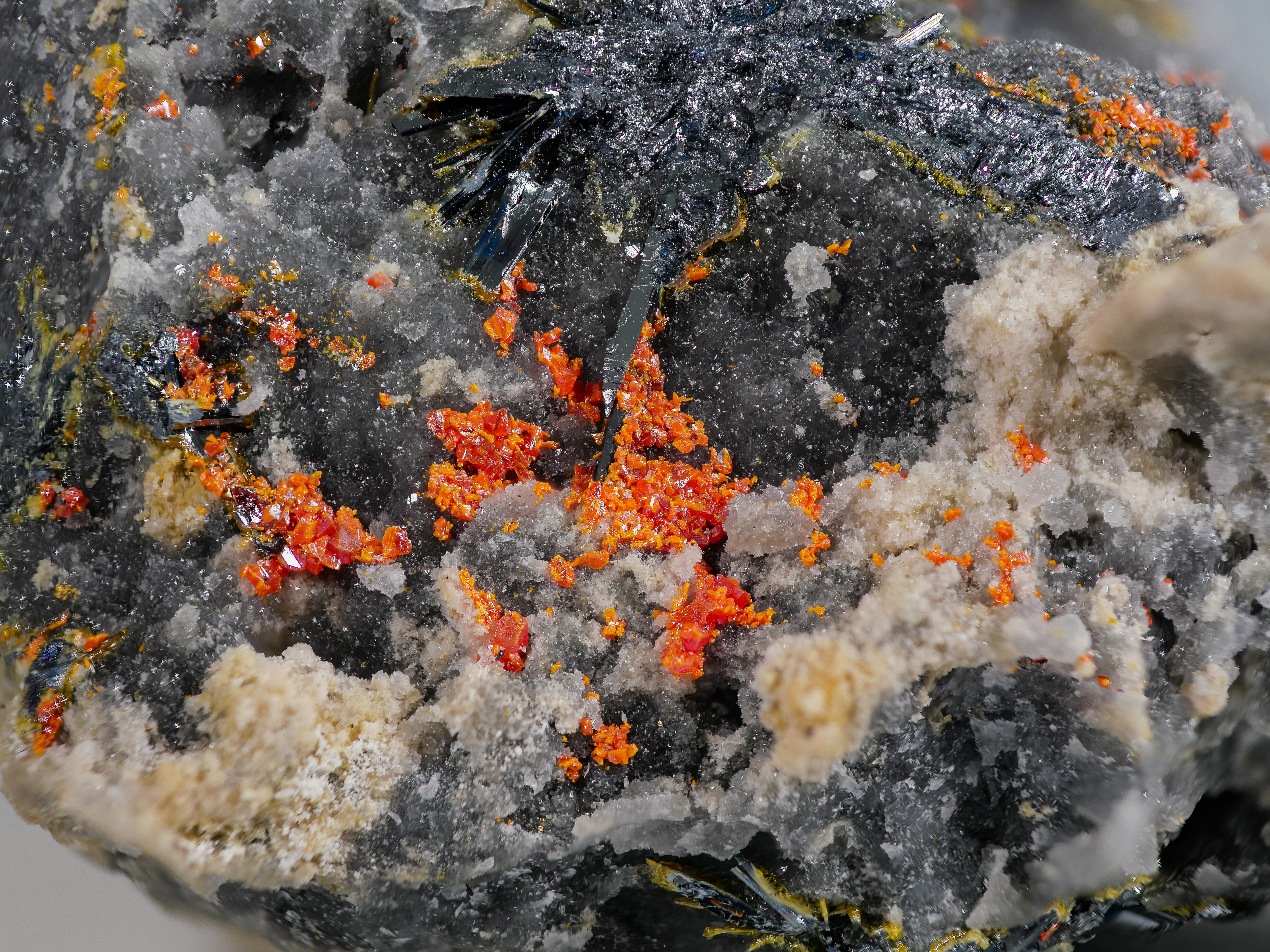 Ich muß mich korrigieren . In der Ganzbildvergrößerung ( die zwar total [entfernt] ist ) sehe ich unterhalb der Antimonit xx eine ganz kleine Stelle mit dem dunkelroten Lorandit !