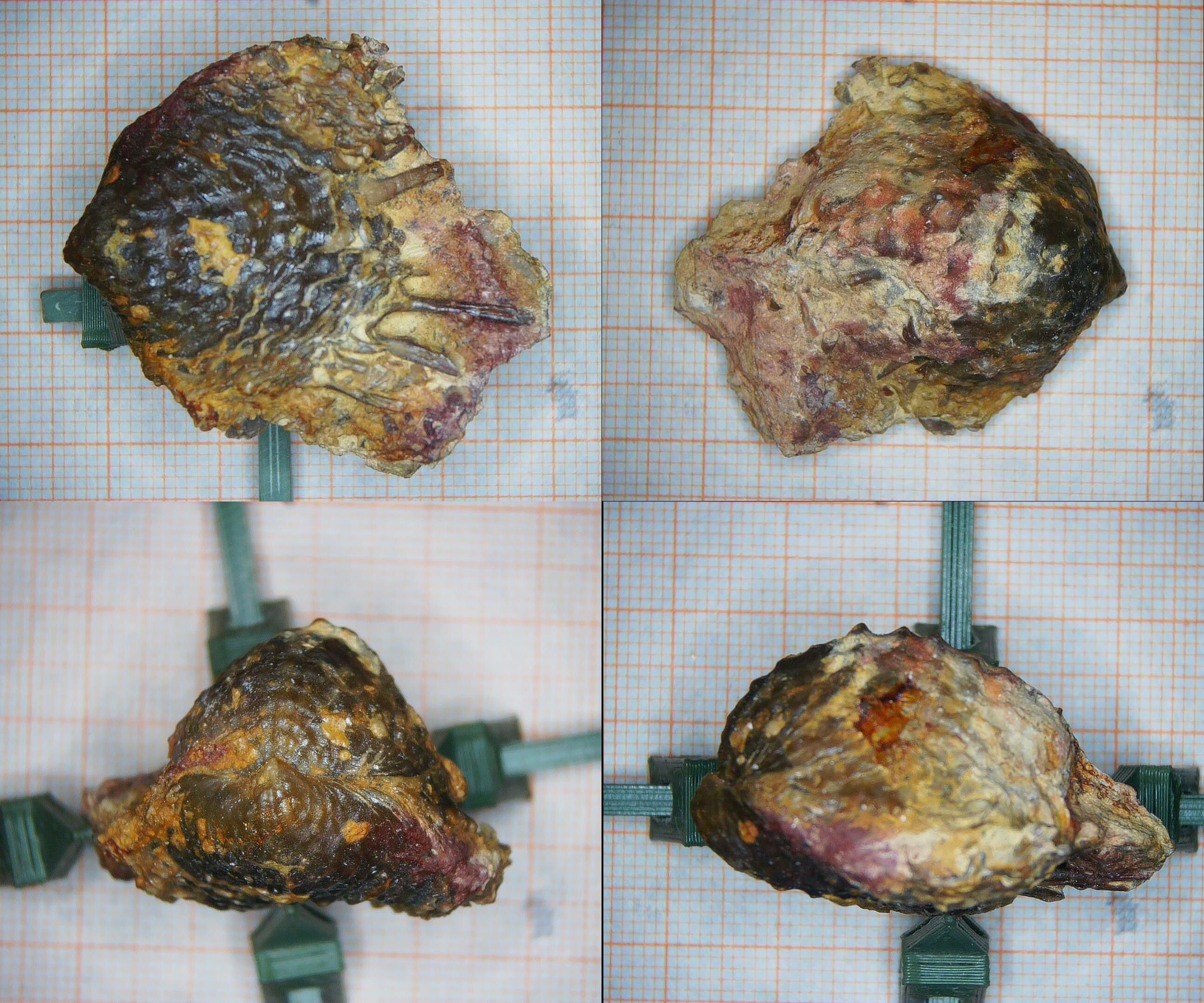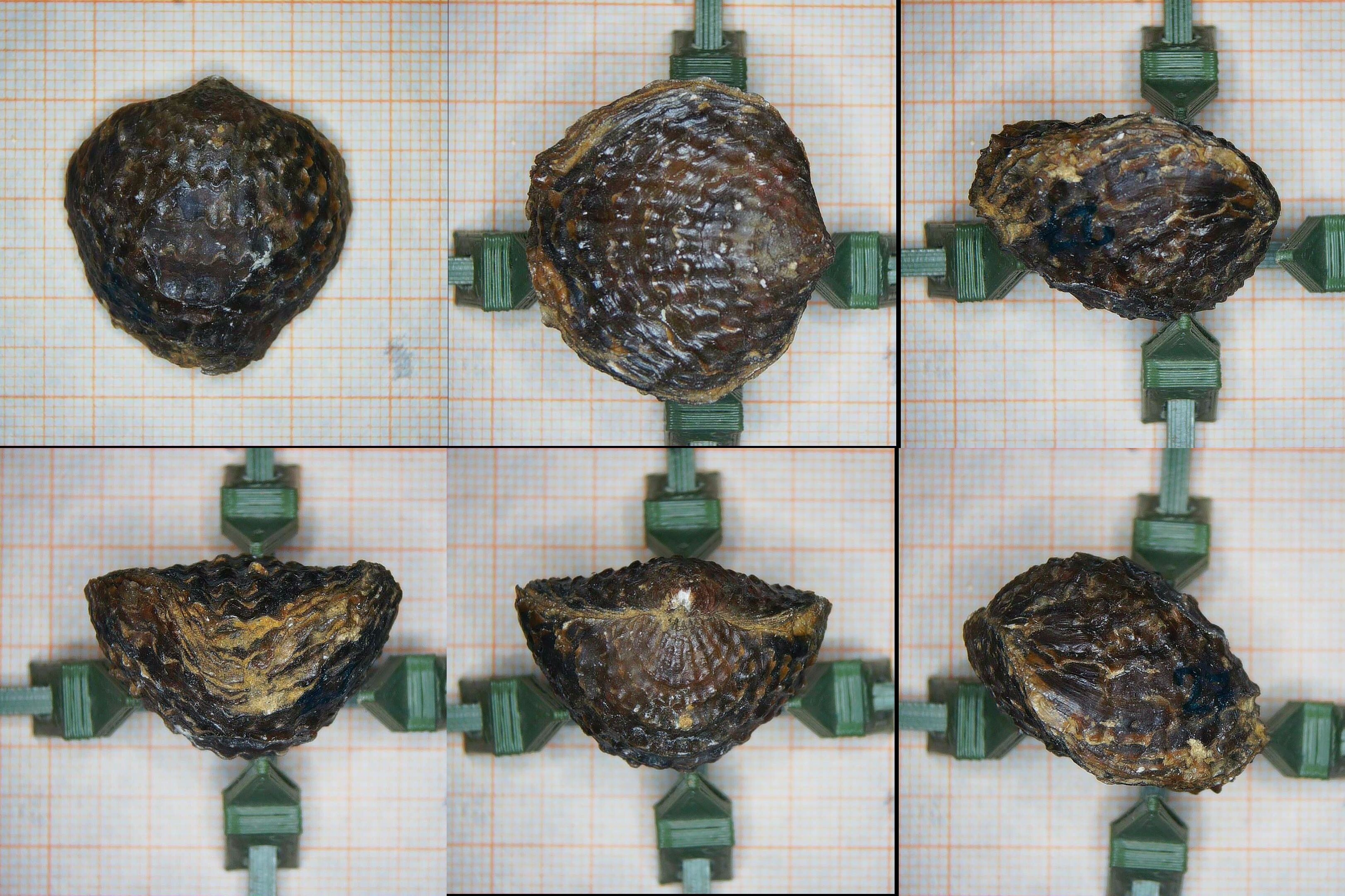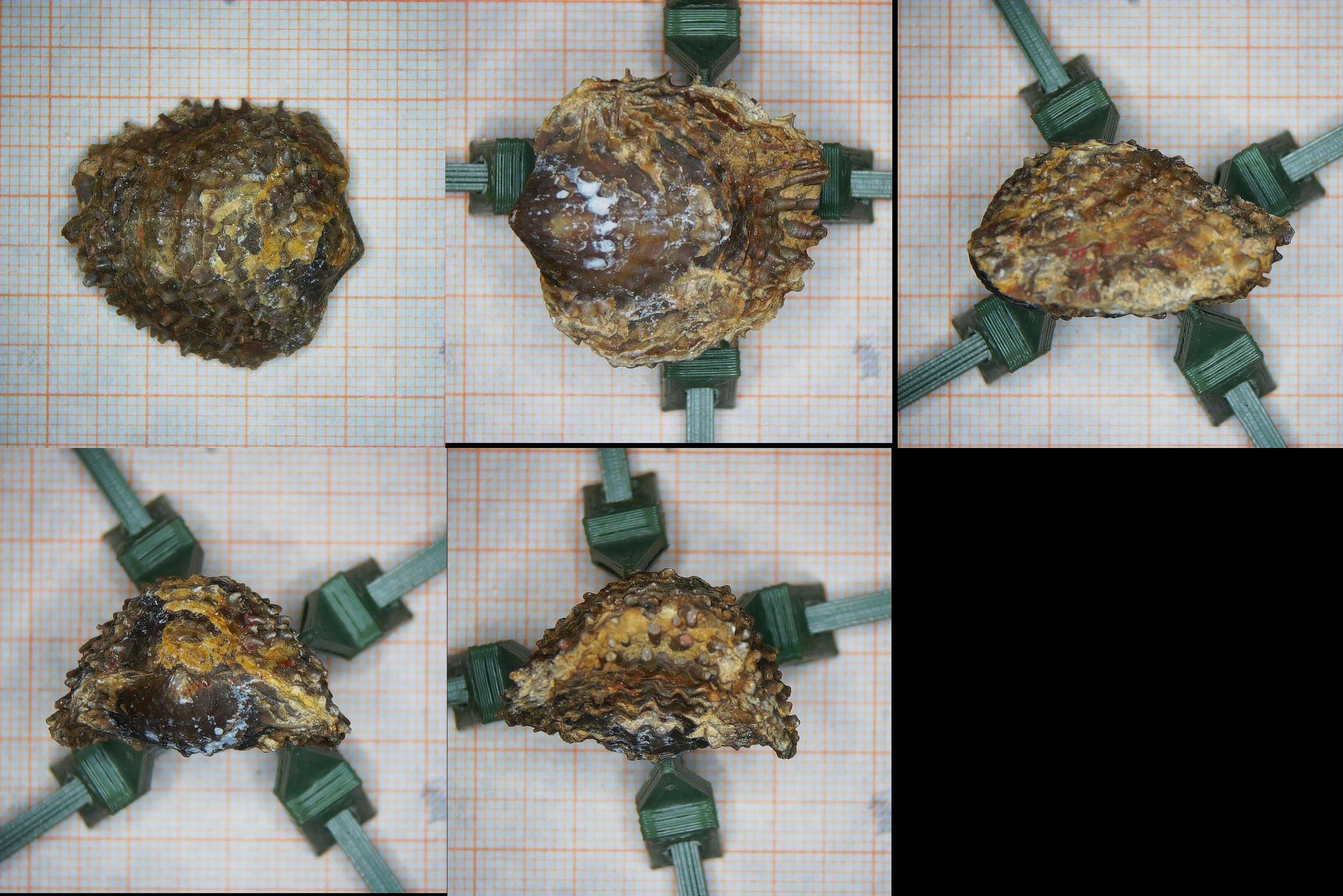 Das ist ein kleiner verstellbarer Halter aus dem 3D-Drucker, um ungleichmäßige Objekte wie diese Brachiopoden richtig positionieren zu können.