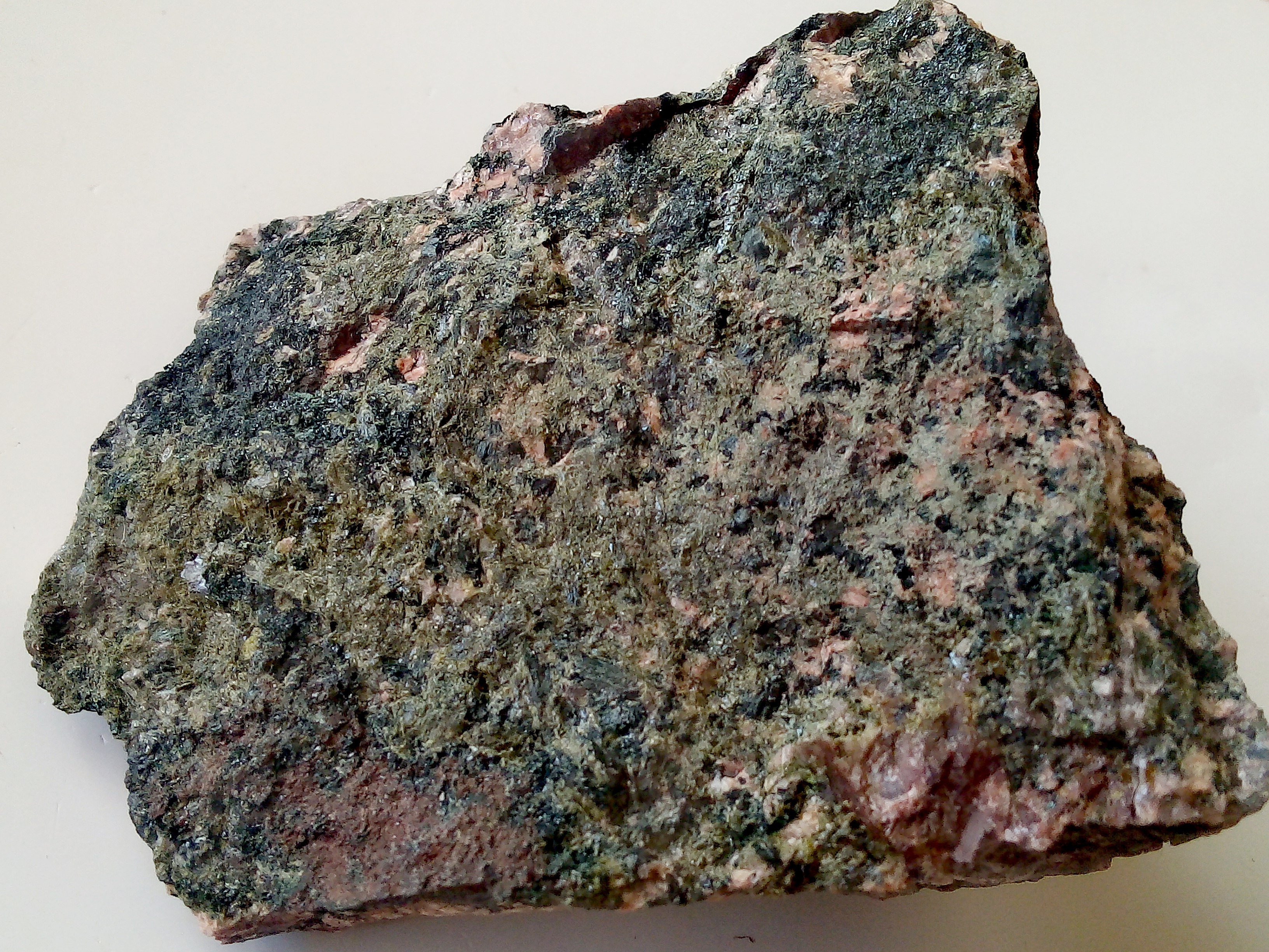 Wenn ich so einen dunkelgünen "Belag" (mini-xx) auf einem Gestein wie Monzonit oder Granit sehe, würde ich als erstes an Chlorit (was auch immer aus dieser Gruppe) denken - zumal in der Paragenese mit Epidot.