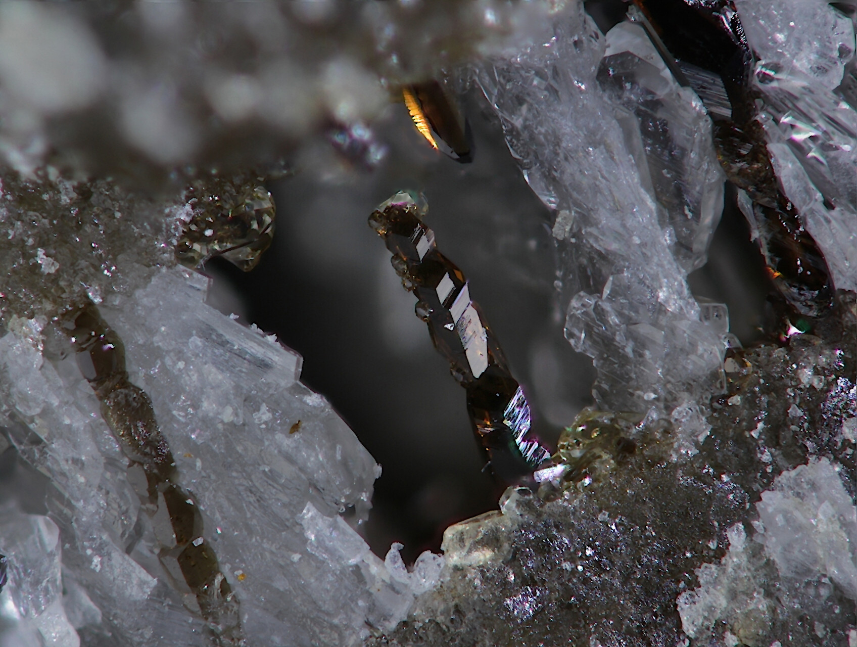 Die Form der Kettenkristalle ist typisch für Granat. Die weißen Kristalle der Paragenese sind auf alle Fälle Diopside.