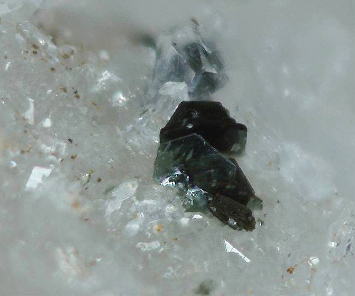 Mit ziehmlicher Sicherheit ist das ein Chloritgruppenmineral. Bildungen von Chlorit und Artverwandten in den Quarzgängen der Region treten regelmäßig auf, manchmal auch zusammen mit Muskovitkristallen. Chlorit & Co sitzen oft auf dem Quarz auf, manchmal sind sie ein wenig im Quarz eingewachsen. Bei beginnender Verwitterung fallen sie schnell ab. Auch exzessives Meißeln zwecks Formatieren der Stücke führt oft zum Verlust der offensichtlich nur schwach an denn Quarz anbindenden Kristalle. Einige Analysen solchen Materials meinerseits zeigen kein einheitliches Bild eines Minerals, aber stets Mitglieder oder Gemenge aus Mitgliedern der Chloritgruppe. Das visuelle Erscheinungsbild passt gut zu einem Chloritgruppenmineral. Ein starkes Argument für Chalkophyllit wäre eine in unmittelbarer Nähe vorliegende Sulfidmineralisation mit z.B. Fahlerz. Das kann natürlich an einem nur kleinen Stück für die Sammlung eventuell schwer zu beurteilen sein. Arsen ist an der Fundstelle ein eher seltenes Element. Tendenziell wird da die Verdünnung schnell zu groß mit zunehmender Transportentfernung, um noch ausreichend Baumaterial für Chalkophyllit zur Verfügung zu stellen. Von anderen Fundstellen aus dem Erzgebirge sehe ich analysierten Chalkophyllit oft in arsenreicher, kupferhaltiger Paragenese.