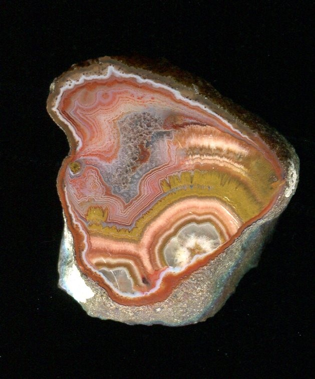 dieser hübsche Achat ist gerade über meinen Bildschirm gelaufen. Bei der Bildbeschriftung wurde ich etwas stutzig. Die Abbildung ist 'Achat' zugeordnet, was ich wohlwollend mittrage. Der Bildtitel 'Quarzpseudomorphose' weicht von der Mineralzuordnung ab, auch wenn die Begriffe Achat und Quarz ja ein gewisses verwandtschaftliches Verhältnis haben. Für Mineralienfreunde, die mit dem Fundort und dessen Material vertraut sind, sind die radialstrahligen Kreisringsektoren leicht als Quarzpseudomorphose zu akzeptieren. Was meine Neugier weckte, sind die durchscheinenden bis weißlichen Partien, die eine Art Kern der radialstrahligen Bildungen darstellen. Sind das Calcitkristalle oder sind das auch Quarzpseudomorphosen?