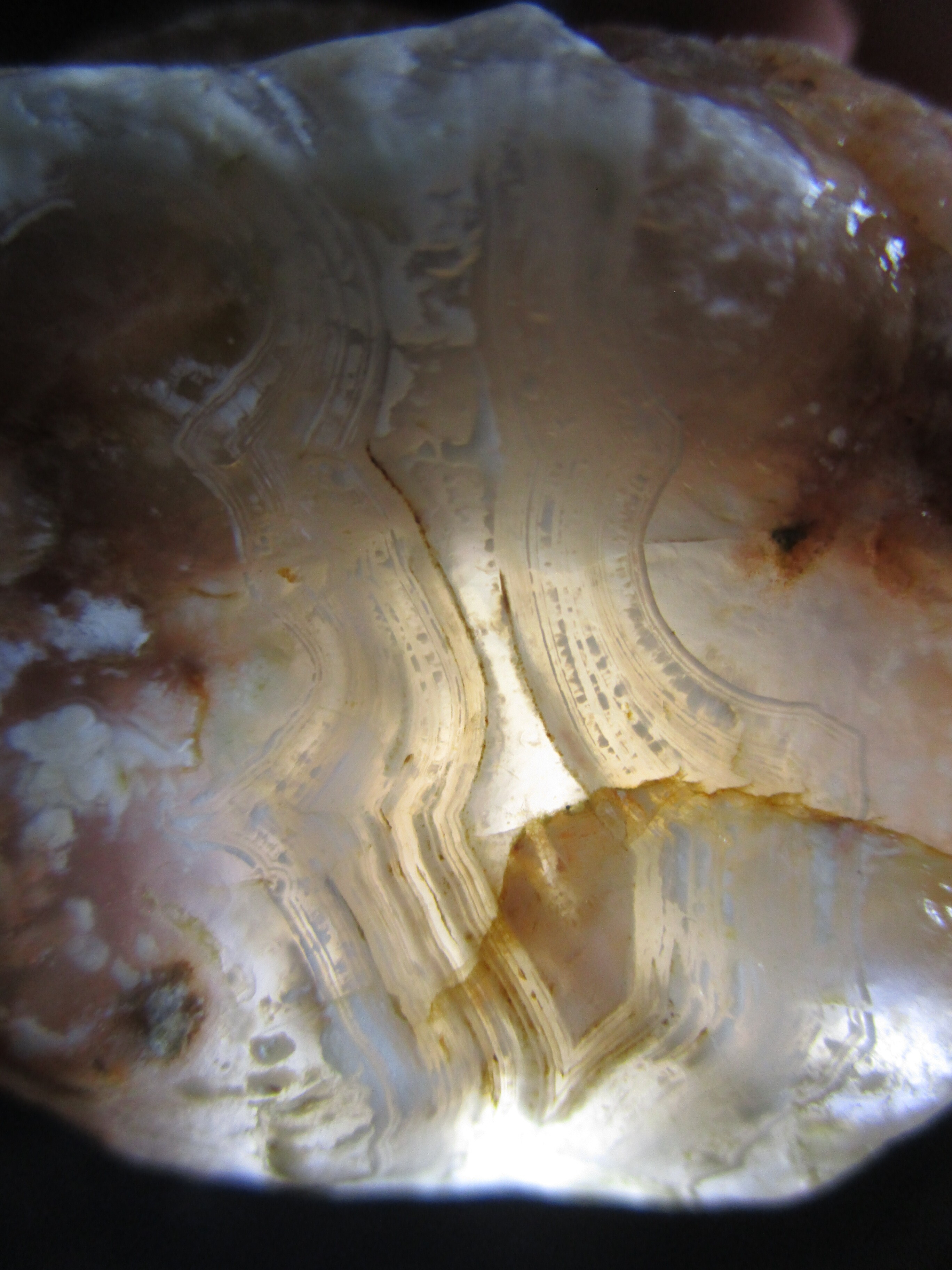 "Sehr helle Chalcedon-Abschnitte die von Litschifarben bis Pfirsich reichen; Der Achat selbst ist ausschließlich Weiß"