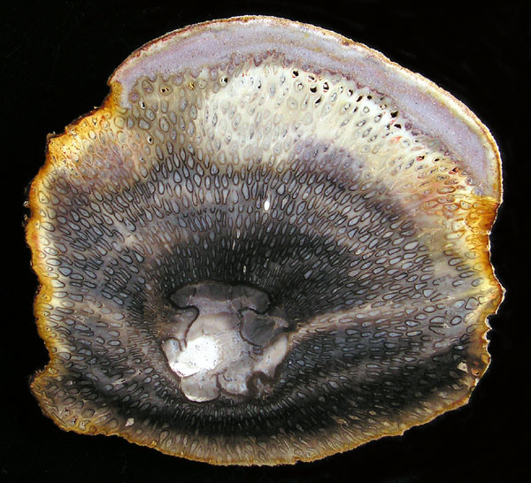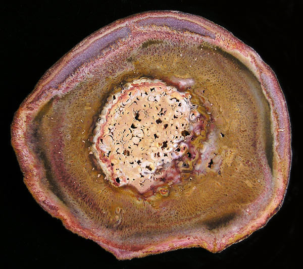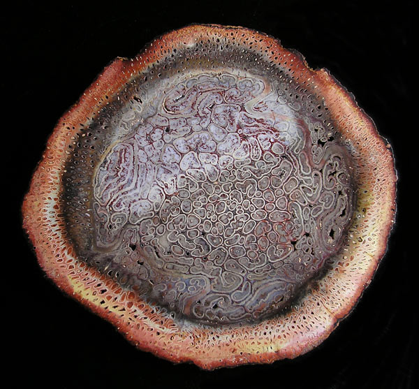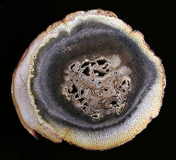 Die für Farnbäume typischen wurmförmigen Leitbündel werden von einem Wurzelmantel umhüllt.