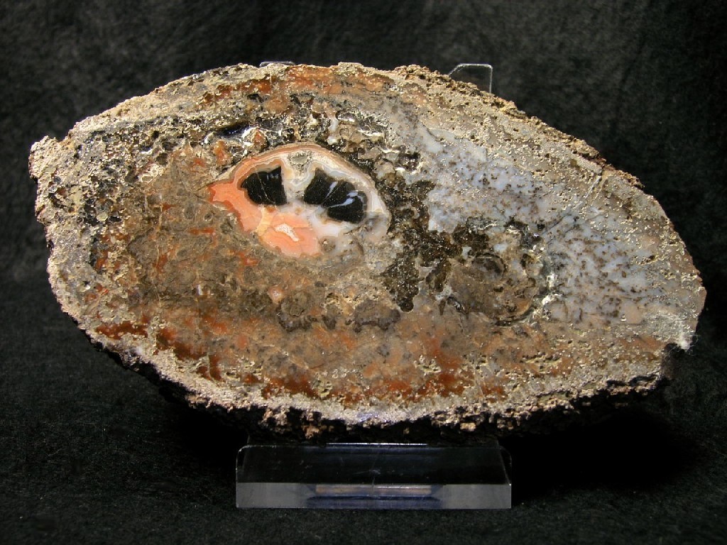 Und vor allem die Strukturen auf der Außenseite weisen doch recht deutlich auf einen Luftwurzelmantel eines Baumfarnes, vermutlich Psaronius sp., hin. Aufgrund des mächtigen Luftwurzelmantels sollte das ein Stück von der Stammbasis bzw. aus dem unteren Stammbereich sein. Ein eindeutiges Zentrum (den eigentlichen Stamm) habe ich bisher aber noch nicht gefunden – ist also entweder an dem Fragment nicht erhalten, oder wegen der erwähnten groben Verkieselung nicht erkennbar bzw. am Rohstück schwer zu identifizieren (es gibt zwar Bereiche ohne [erkennbare] Röhren, aber eben leider auch ohne die für Psaronius typische „schleifige“ Kernstruktur). Und, nur am Rande: teils sind die „Röhren“/Luftwurzeln als freistehende „Säulchen“, über und über von kleinen Quarzkristallen bedeckt, erhalten.