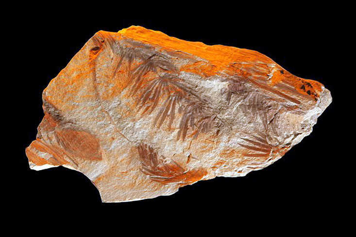 Das Foto 3a zeigt einen sterilen Laubzweig von Asterophyllites equisetiformis Schlotheim 1820. Links ragt noch die Spitze einer, zur gleichen Pflanzenart gehörenden, Sporophyll-Ähre auf's Handstück. Ganz oben könnte noch ein (ebenfalls dazugehörender) "Ast" (Achse vorletzter Ordnung) liegen - das ist aber orange überstrahlt nicht ganz sicher auf dem Foto erkennbar. (Die Achse mit der typischen Astbelaubung in Foto 2b ist dafür aber schön und eindeutig!)