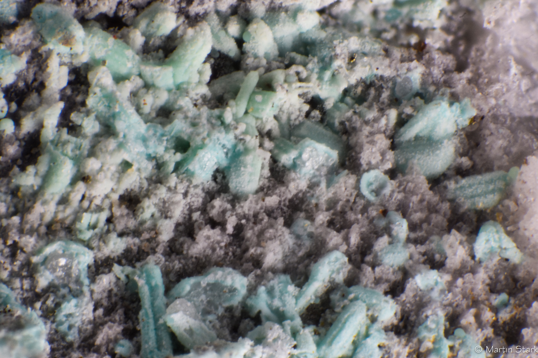 Der Mimetesit enthält geringe Anteile an Cu und Zn. Überwiegend erscheinen mir die Kristalle weiß bis grünlich und die gelegentlich blaue Farbe könnte meiner Vermutung nach auch ein Überzug mit ( oder eine Einlagerung von) Aurichalcit (?) Kristallen in die Mimetesit-Aggregate sein. Mit Salzsäure ging die Blaufärbung (aber die Grünfärbung eher nicht) weg... Andererseits habe ich keine deutlich ander Phase im Mikroskop auf den Mimetesiten gesehen.