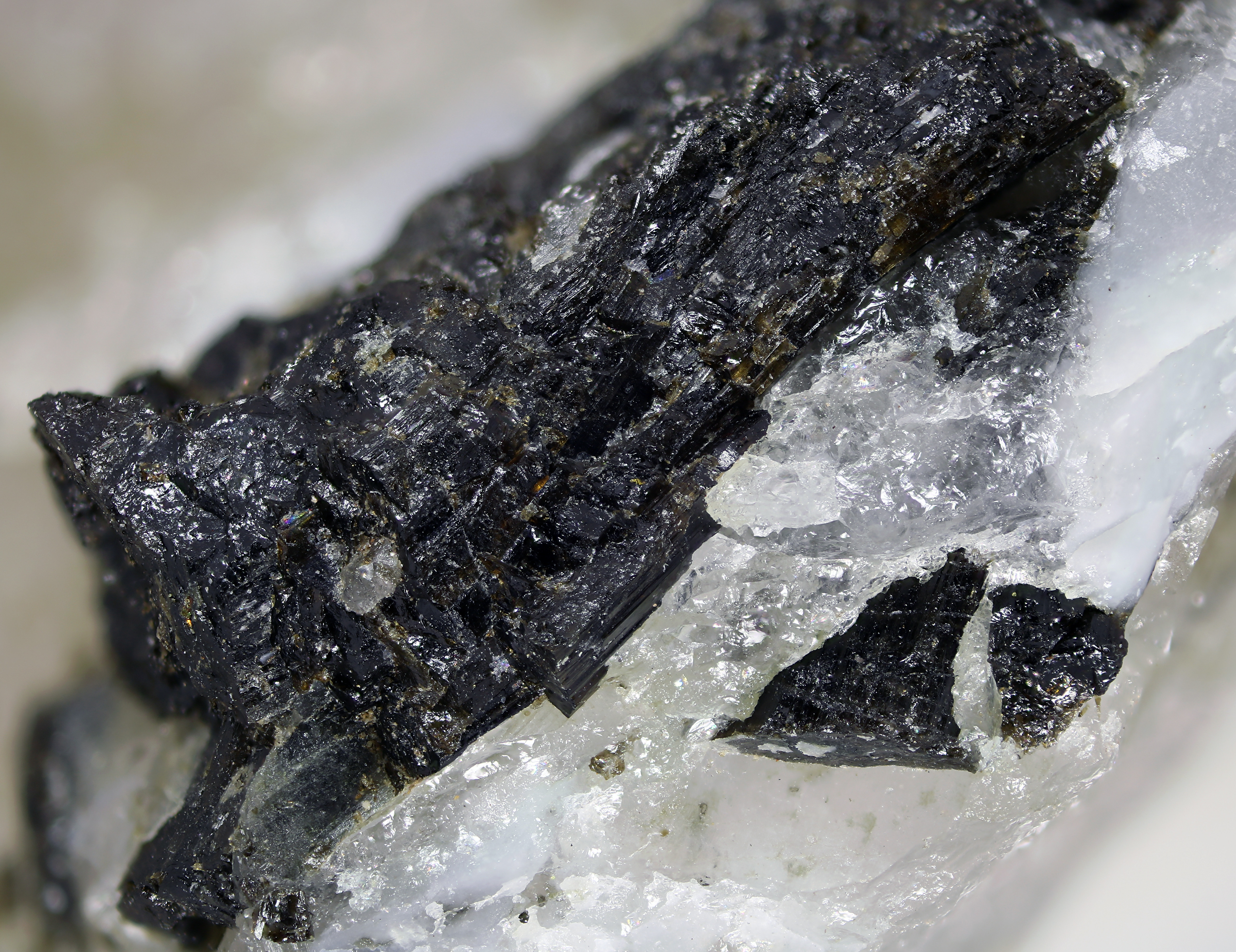 Bei dem Bild würde ich Aktinolith wie vermutet eher ausschließen. Aktinolith zeigt eine doch recht deutliche Spaltbarkeit parallel zur c-Achse (Längsachse). Für eher wahrscheinlich halte ich Schörl, bzw. ein Mineral der Turmalingruppe.