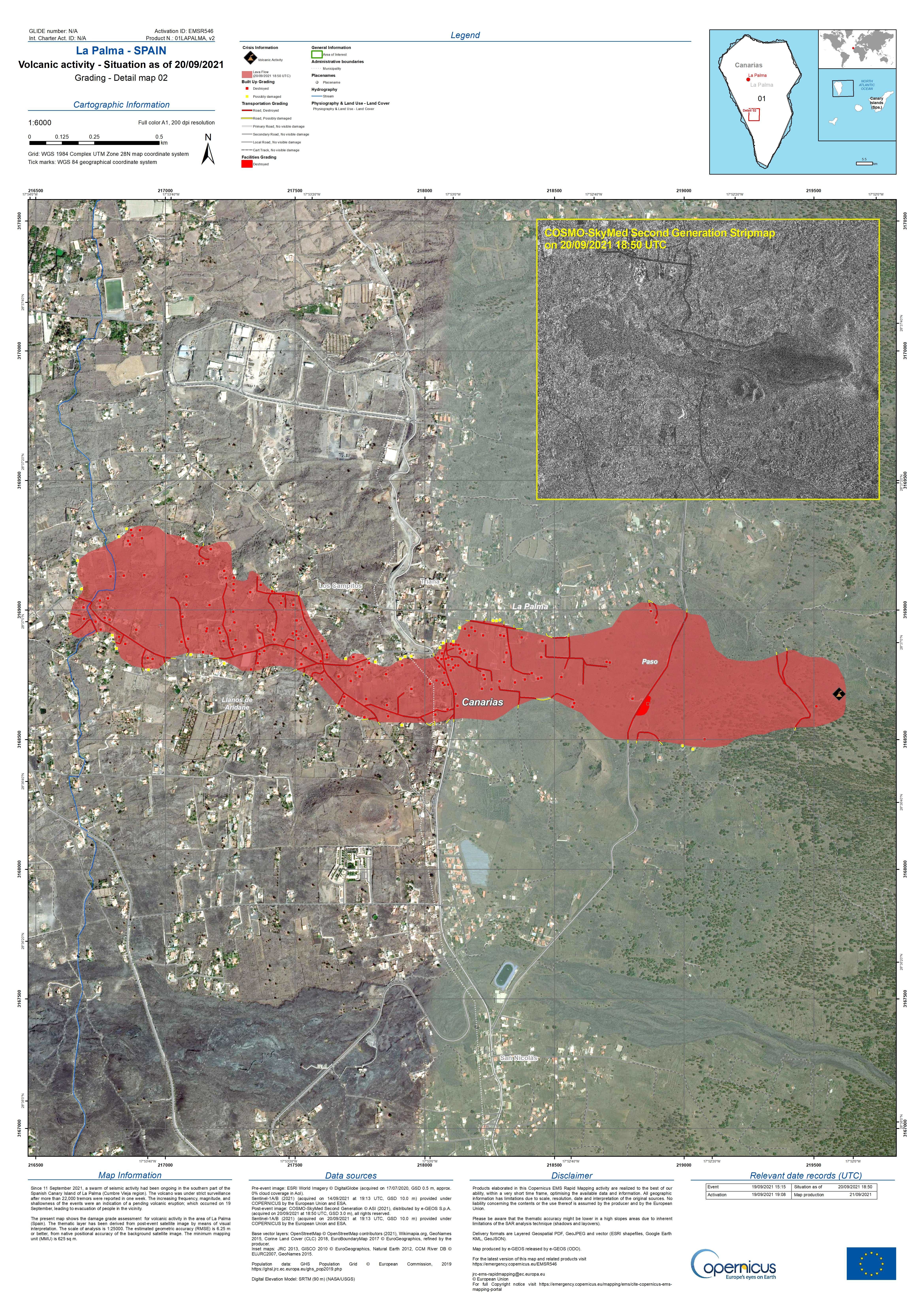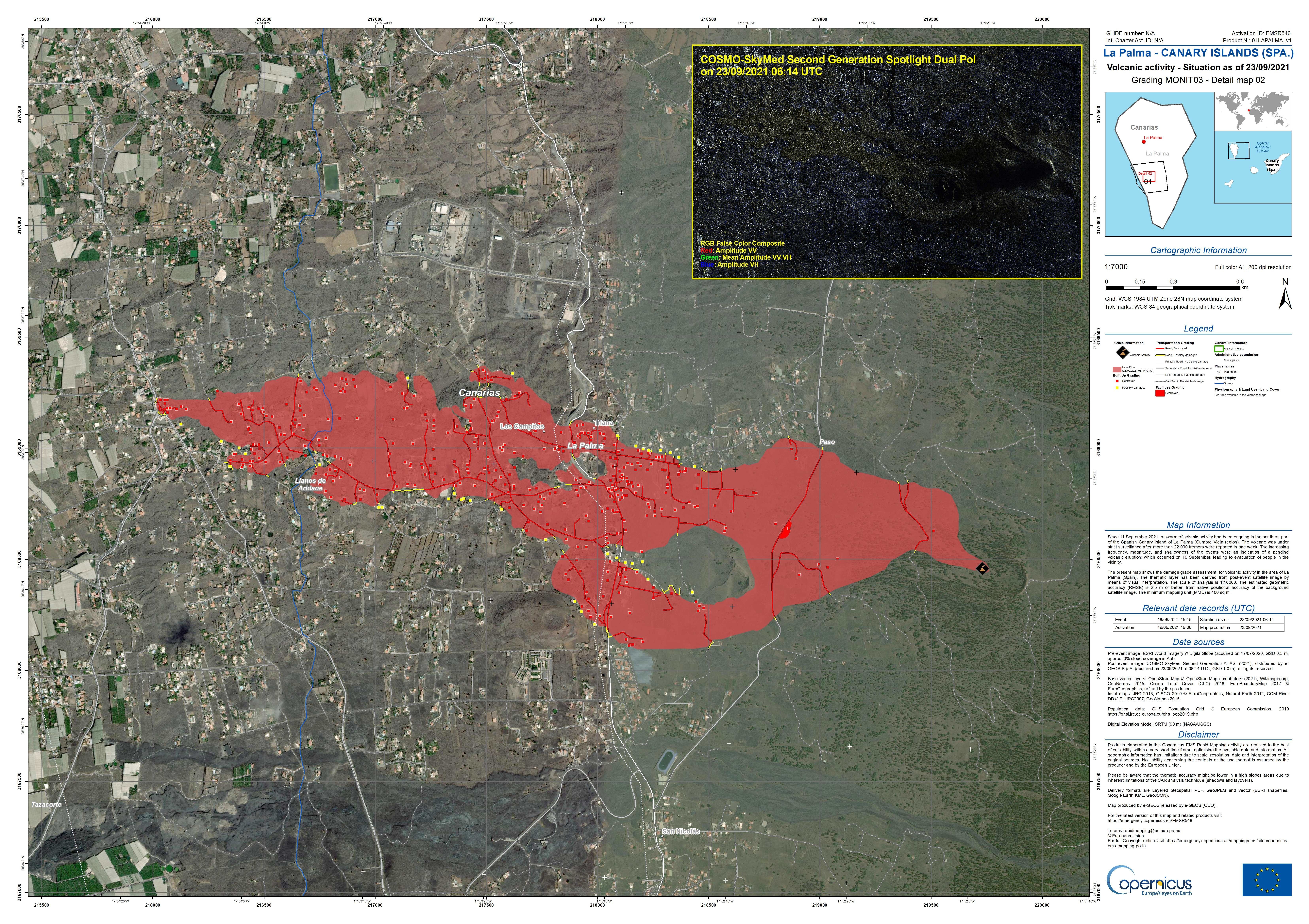dort herunterscrollen bis "Rapid Mapping", anklicken, und man landet auf einer Übersicht, in de man dann aus mehreren Ereignissen (u.a. Waldbrände in Spanien etc) auf einer Karten den Vulkanauspruch auf La Palma anklicken kann. Oder direkt