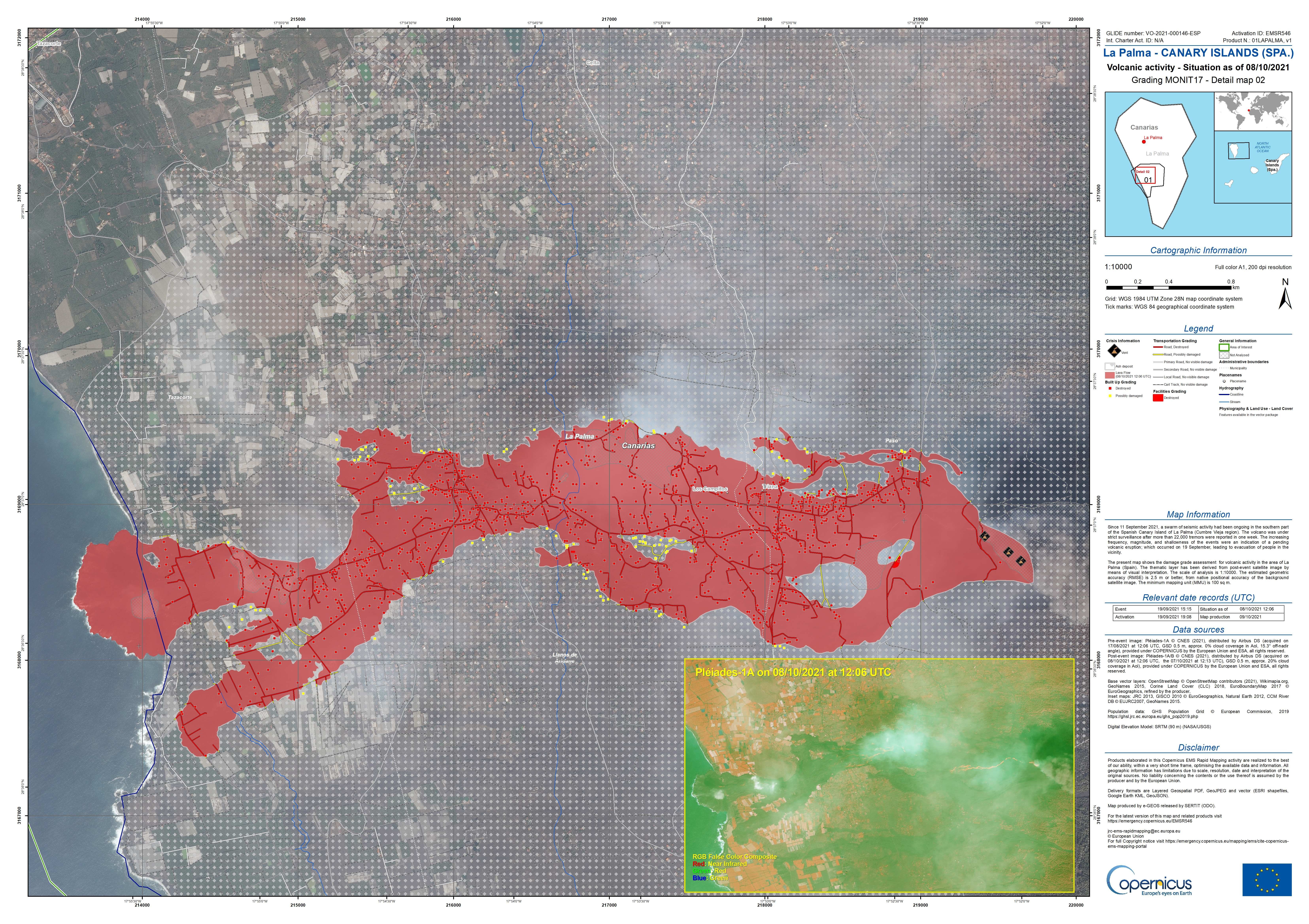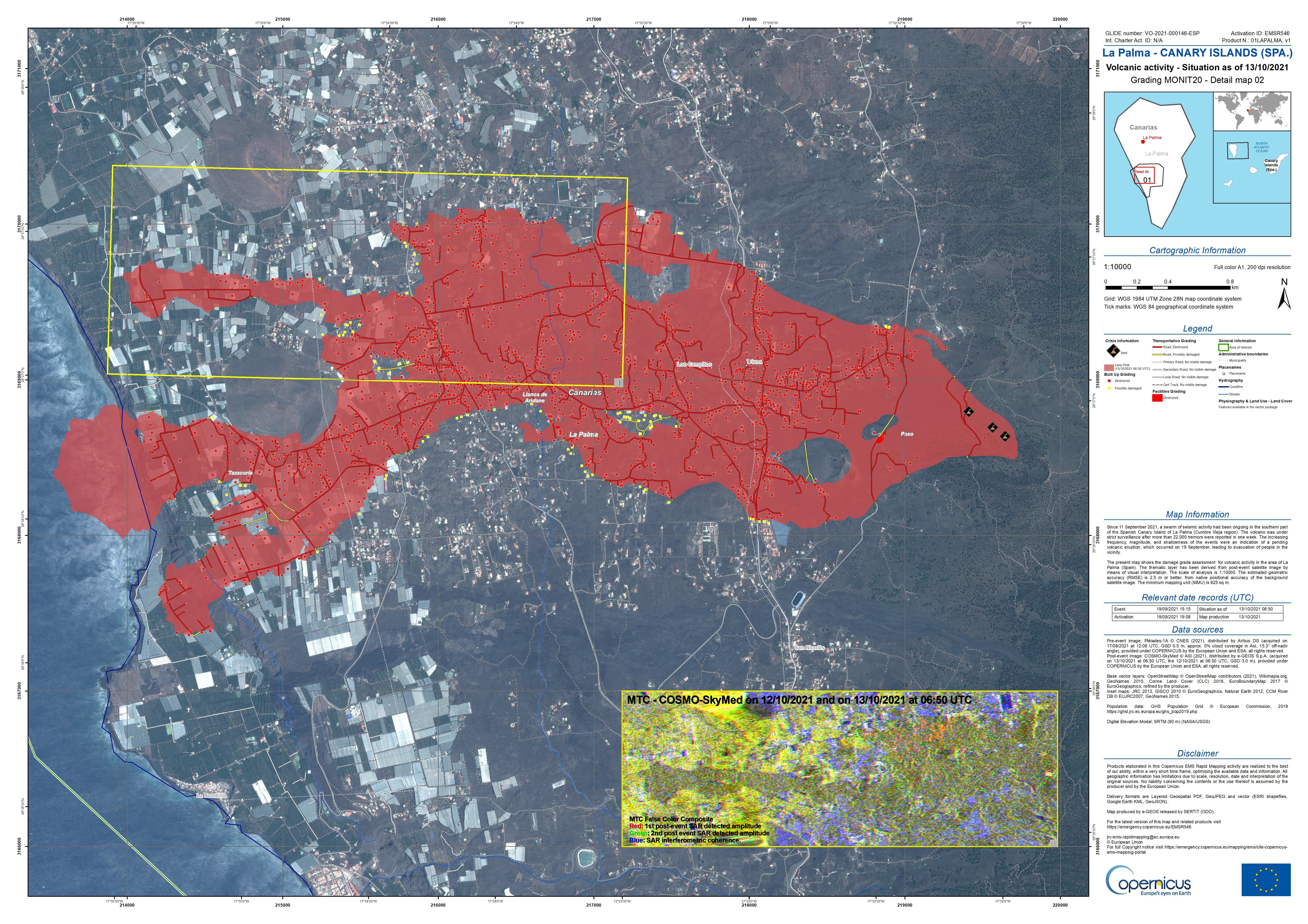 Zweites Bild: Zwischen der Solaranlage und dem alten Krater fließt die Lava. Der rote Krater im Vordergrund wurde umflossen, Die Solaranlage ist genau die südliche Kante.