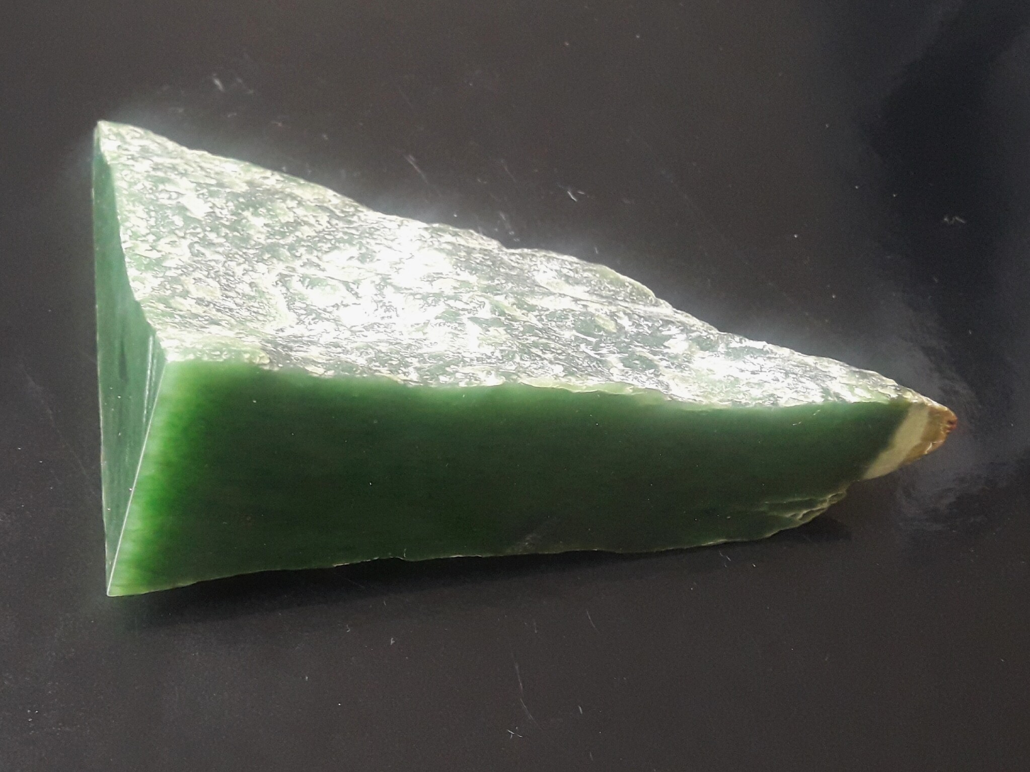 Es handelt sich bei diesem Schnittrest um Nephrit (Aktinolith), nicht um Jadeit.