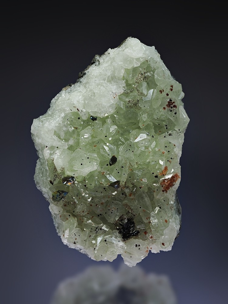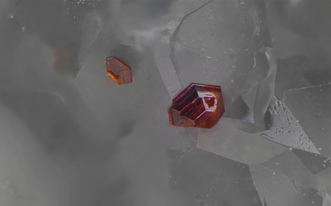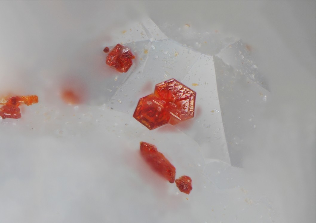 Das Foto zeigt eine nicht näher bestimmte "Pyromorphit"-Kristallgruppe, wohl gesprenkelt mit Hämatit. Bildbreite, ca. 1-2 mm.