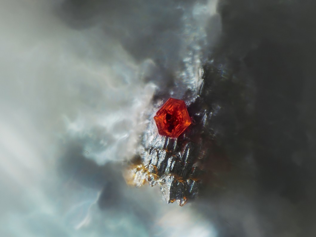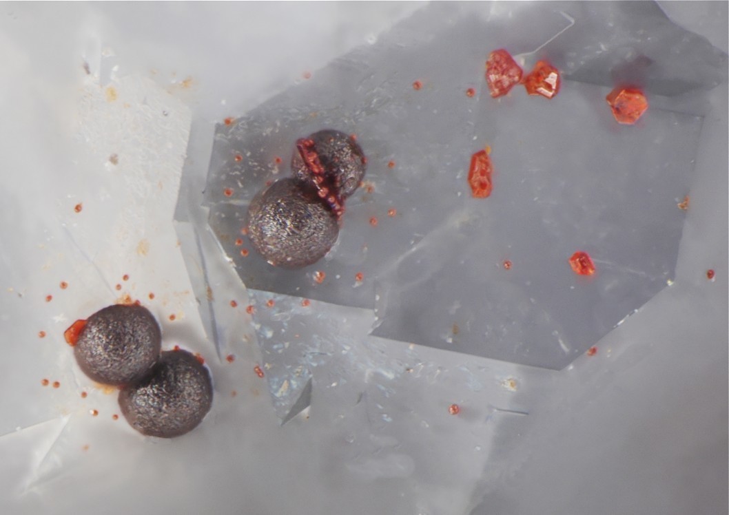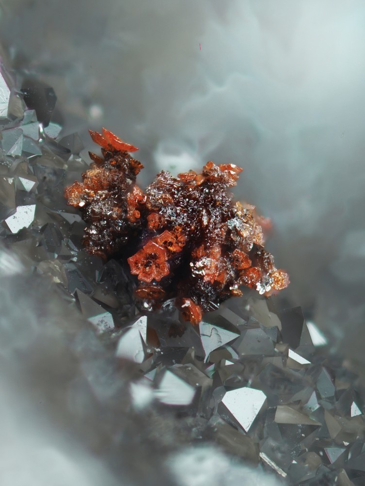 Das Foto zeigt eine nicht näher bestimmte "Pyromorphit"-Kristallgruppe, wohl gesprenkelt mit Hämatit. Bildbreite, ca. 1-2 mm.